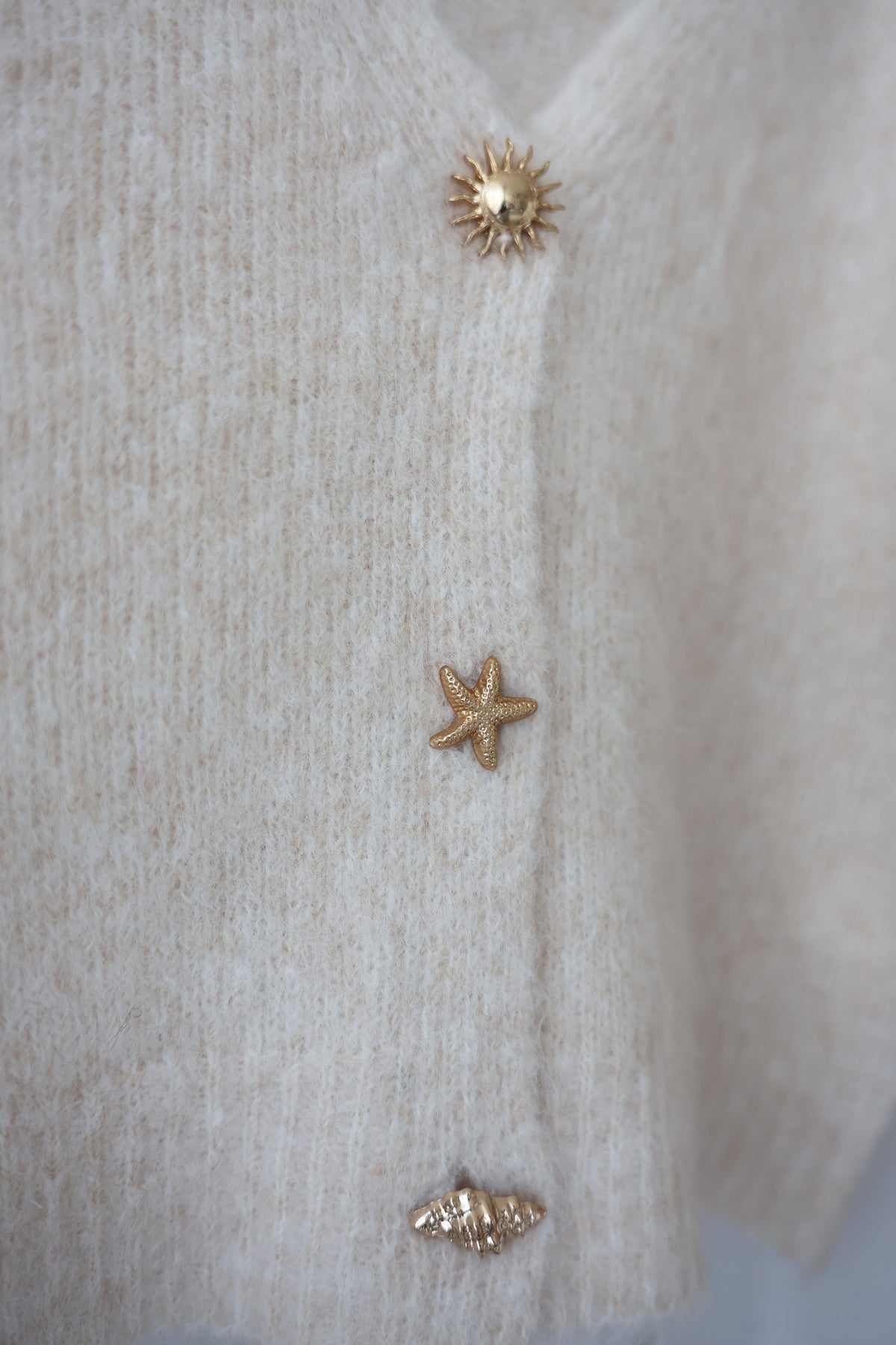 • goldene Knöpfe in Form einer Sonne, eines Seesterns und einer Muschel