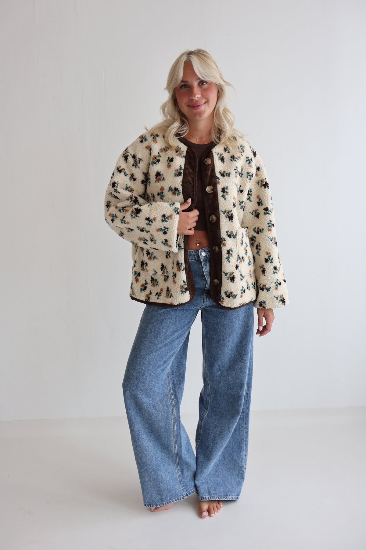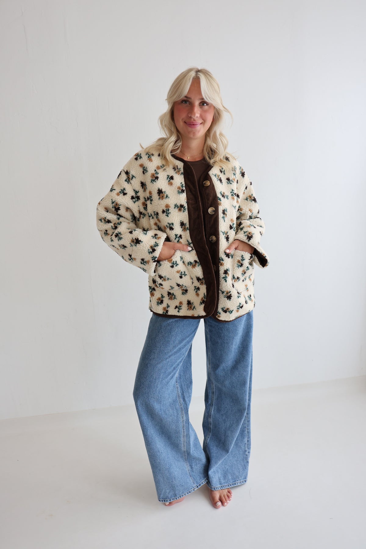 - Super schöne Jacke in Teddyoptik mit Floralprint und braunem Cordeinsatz
