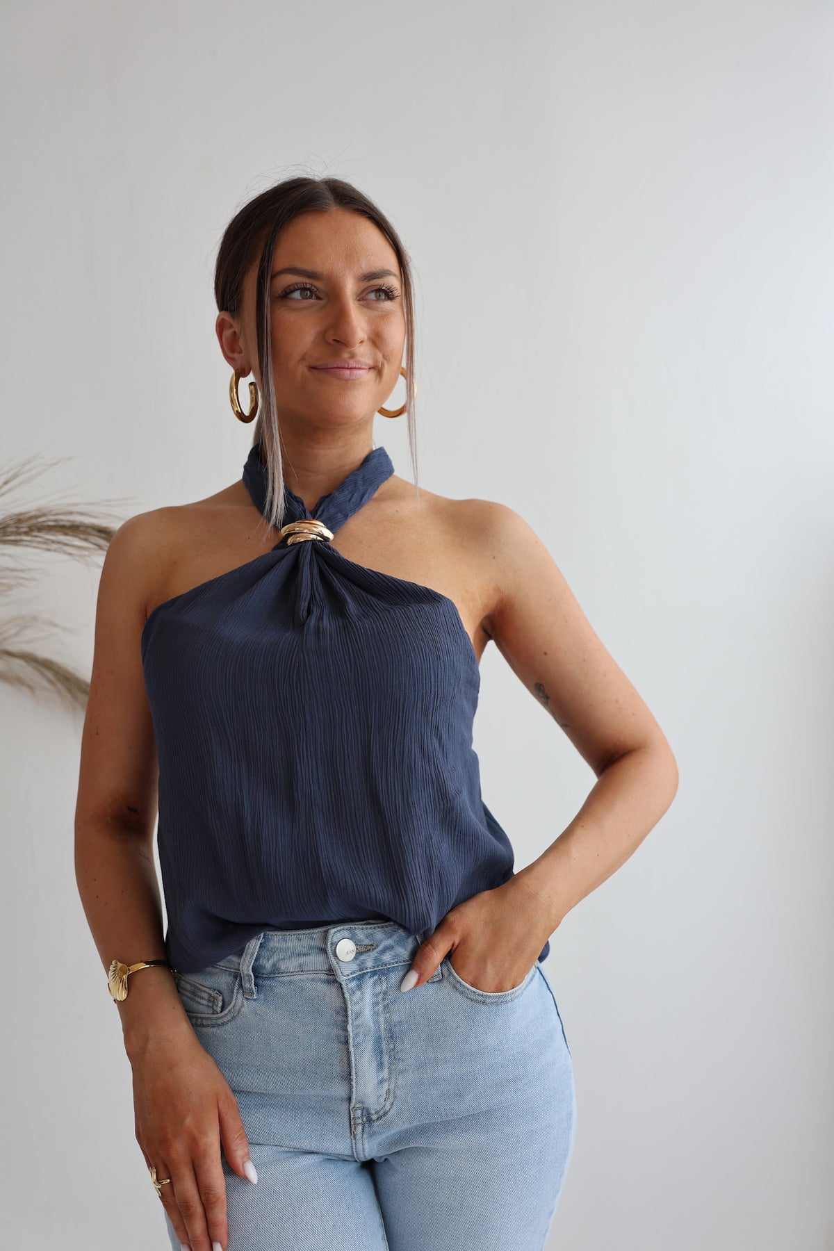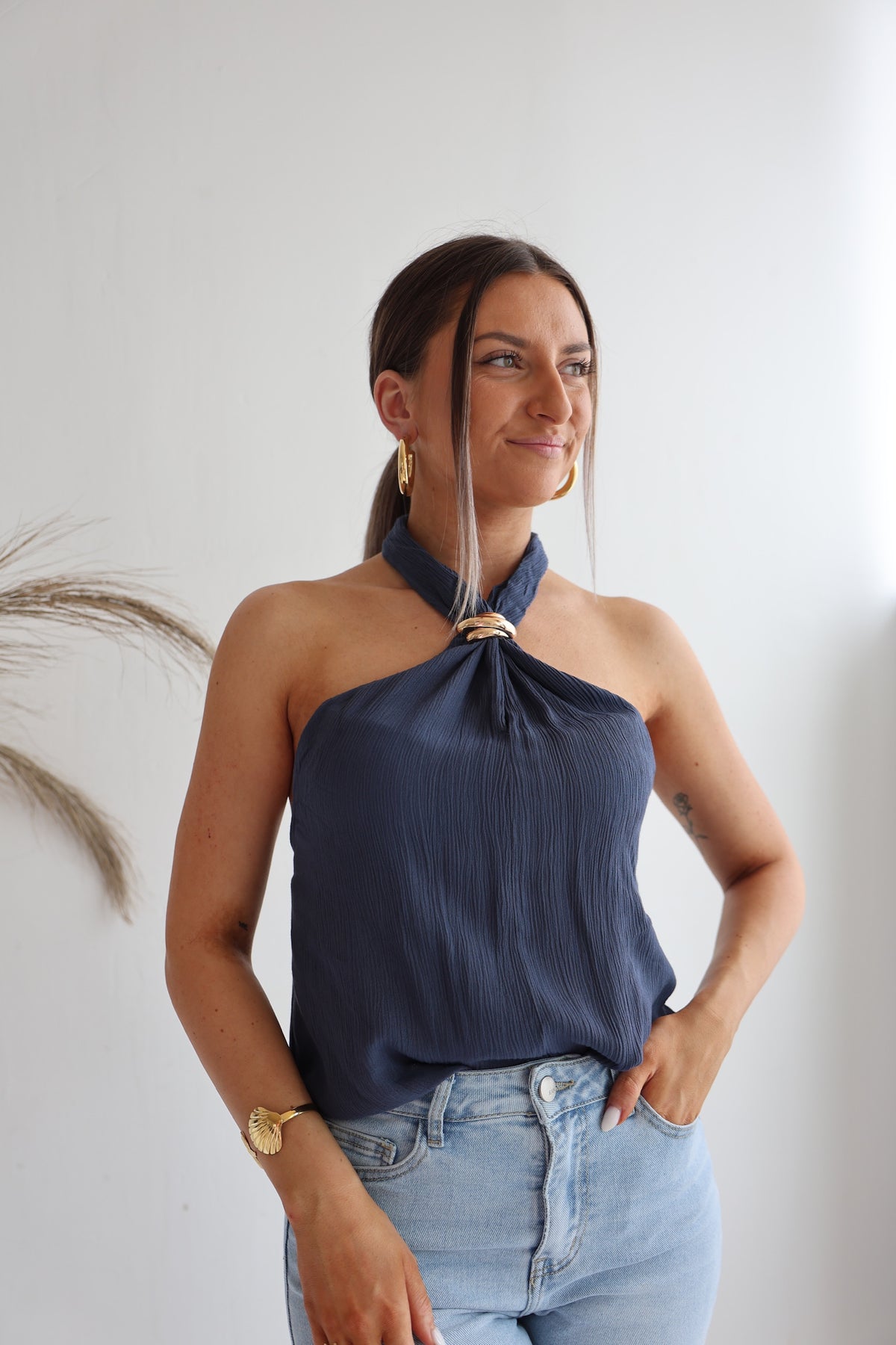 • Neckholdertop mit goldener Brosche im Dekolleté
