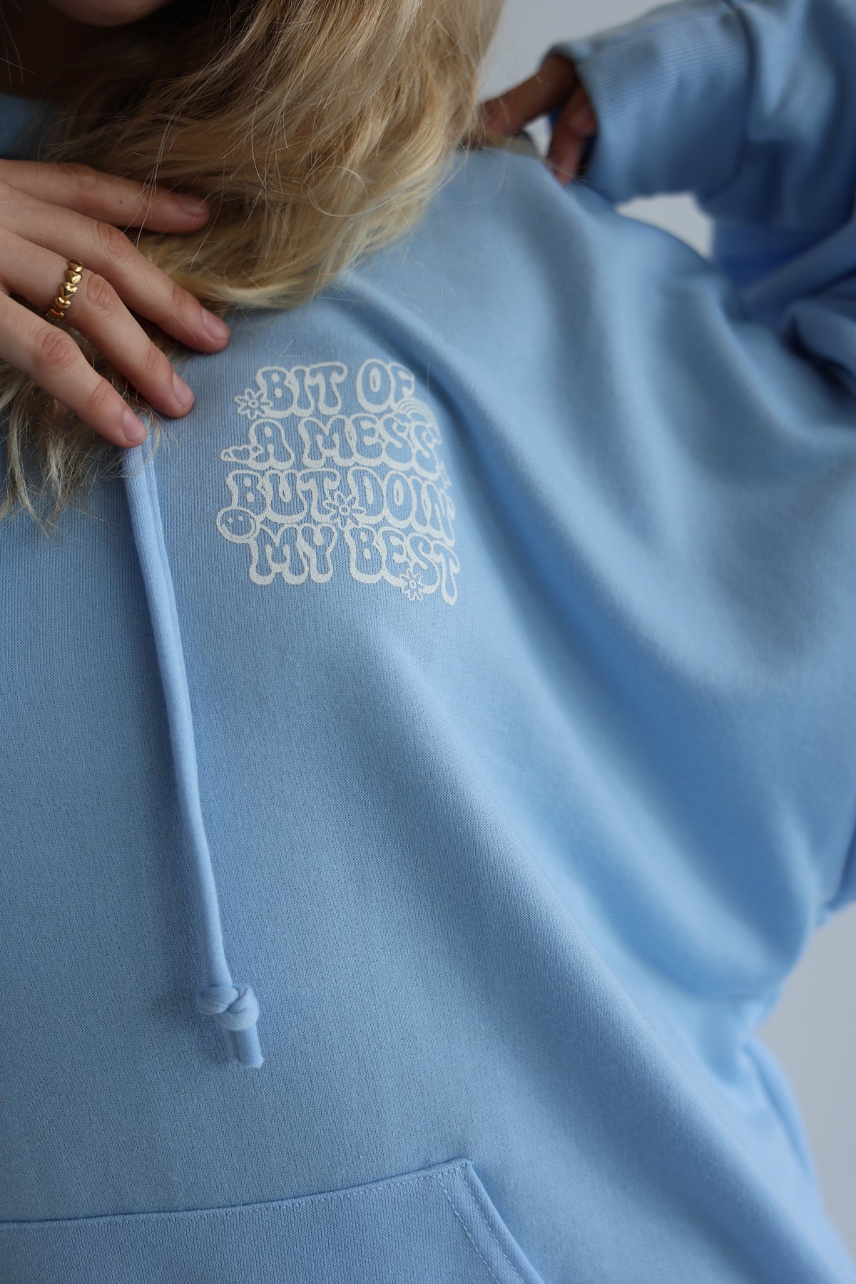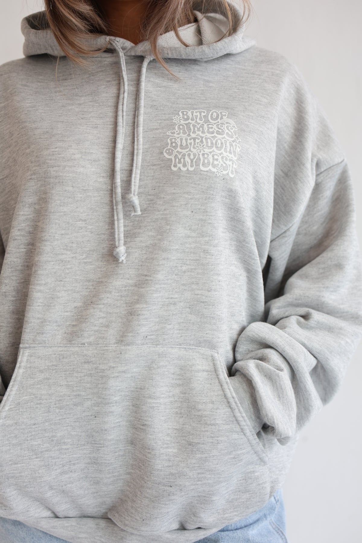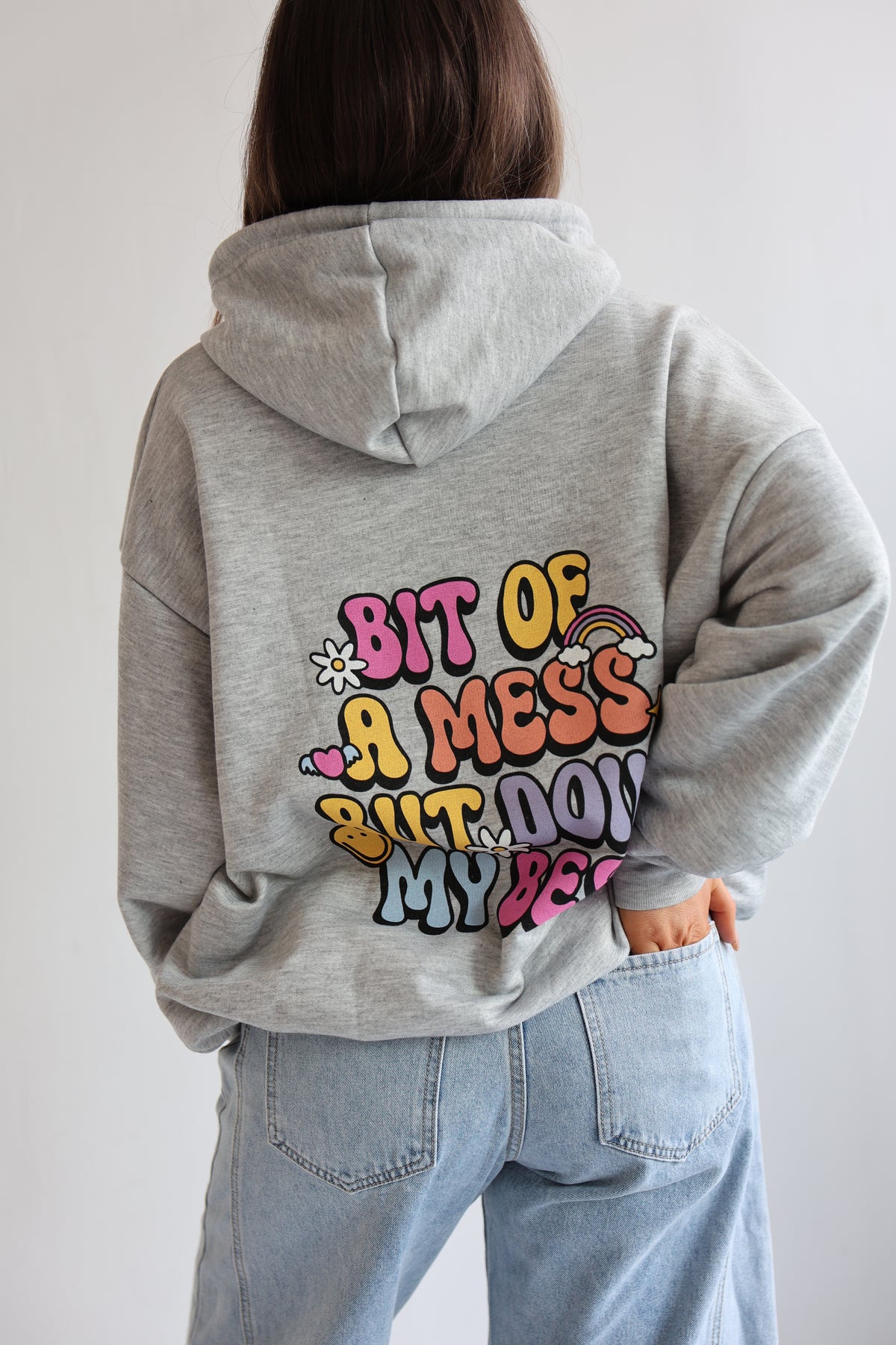 • Super weicher Oversize Hoodie mit der Aufschrift “Bit of a mess but doin my best“ auf der Rückseite und auf der Vorderseite
